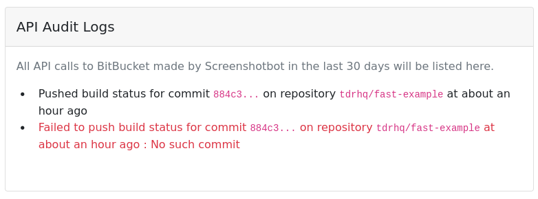 Screenshotbot keeps a log of every API request we make to BitBucket on your behalf. This log can be used to get an understanding of how we use your access token, and also to debug any integration issues with BitBucket.