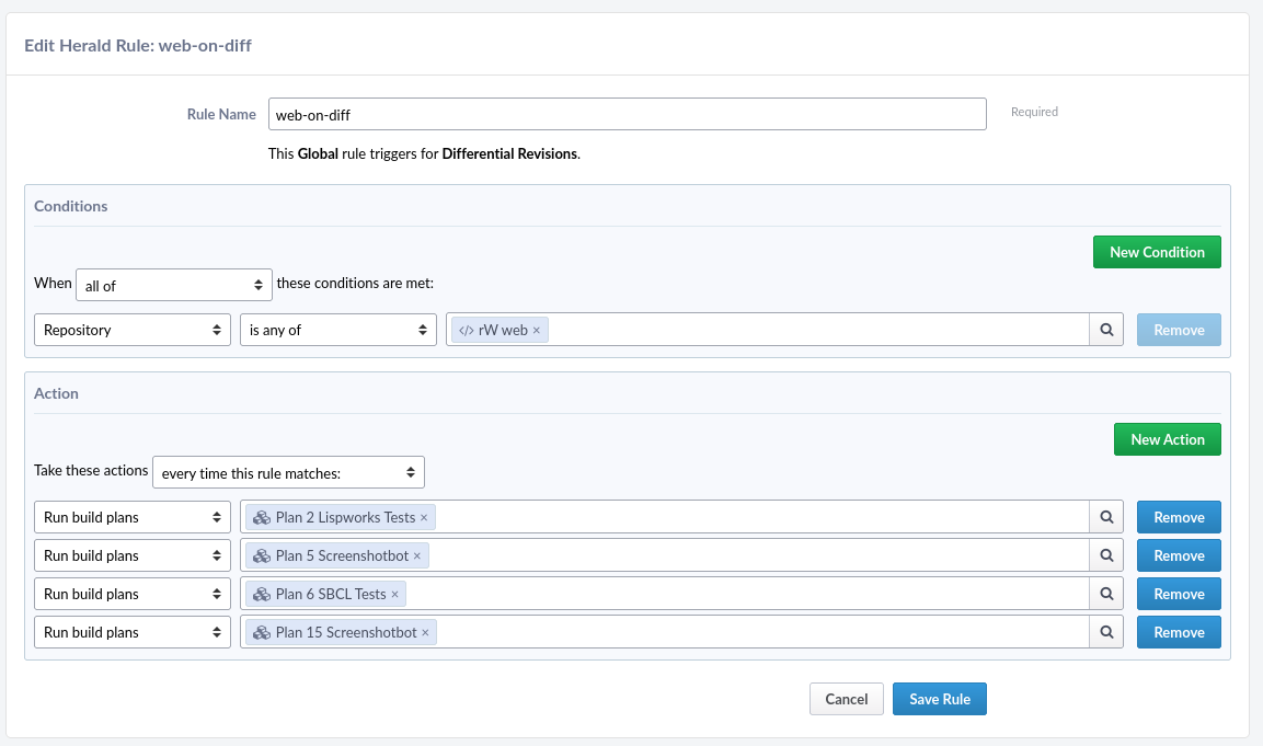 You most likely already have a Herald rule to trigger builds on diff. Find this rule, and modify it to trigger the Screenshotbot Build Plan we just created. Here's what that Herald rule looks like on our Phabricator instance: