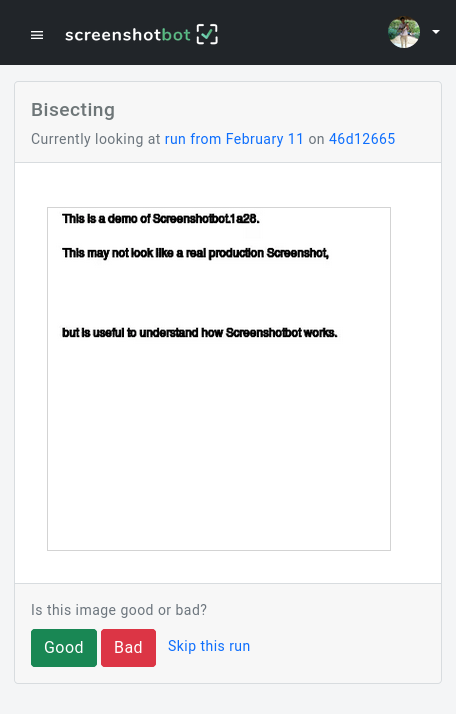 Screenshotbot will now ask you a series of questions to check if an intermediate screenshot is good or bad: