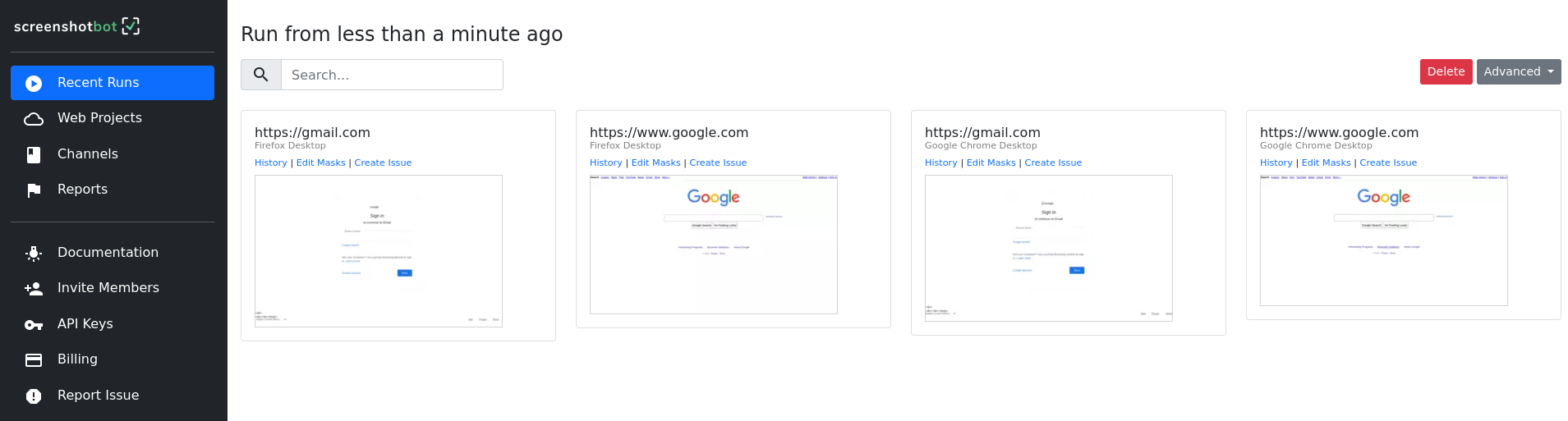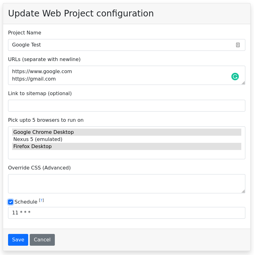 Save your project, and that's it! Every day, we'll now take a screenshot of gmail.com's home page and google.com, and notify you if anything changes.